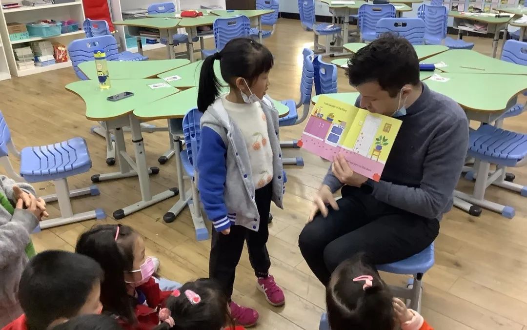五年級(jí)的大哥哥大姐姐們給低年級(jí)的弟弟妹妹們讀繪本。